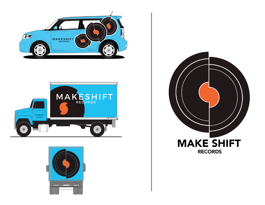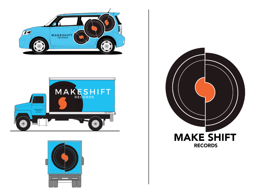 Makeshift Records was created for an Intro to Graphic Design class project. The assignment was to create a brand identity, a story behind the record label, and an accompanying logo and vehicle graphics. I chose to portray Makeshift Records as a label that is a starting point for smaller bands getting their feet in the door of the music industry. In furtherance of this, I created graphics that sought to establish the label as an alternative to larger corporate rivals.