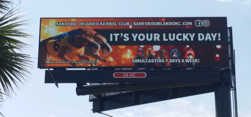 This billboard was designed for the Sanford Orlando Kennel Club. It was displayed as a digital billboard on 17-92 and also as a traditional static billboard on I-4. When I first started designing this piece I knew that it had to be eye-catching, fun, and positive. I was also aware that I could only include a limited amount of information, as passengers in passing cars would have a brief window of time to absorb the content. The billboard was a big success and many customers report that it was what initially drew them to visit.