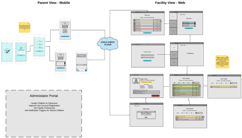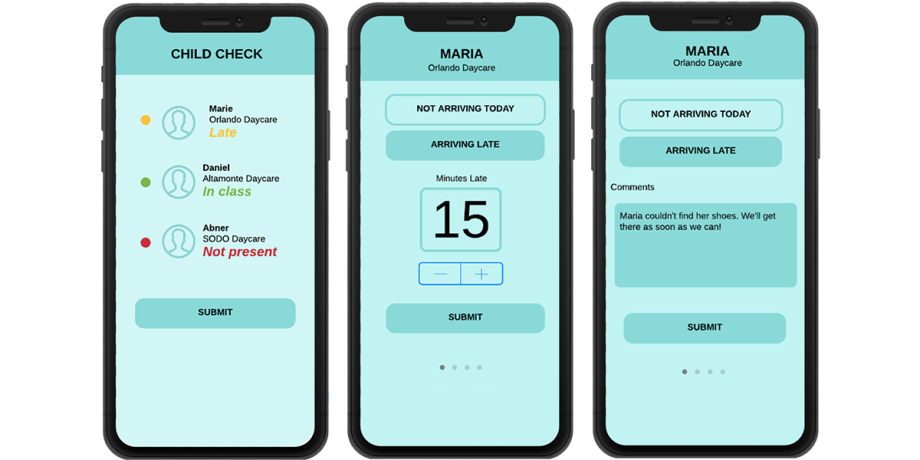 The initial brainstorming design was created in Lucid Charts. It was a general overview of the UI and how the app would flow. I designed the screens with the hope of offering visual simplicity for a busy parent or guardian who's trying to get themselves and their child ready in the morning. Bright / calming colors were selected along with an interface with no frills that got straight to the point.